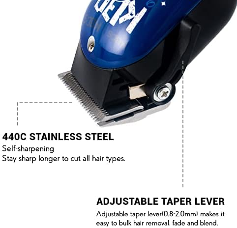 ใPeofessional Precisionใ440C Stainless steel precision blade Self sharpening, Stay sharp longer to cut all hair types. Adjustable taper lever(0.8-2.0mm) makes it easy to bulk hair removal,Fade and blend.