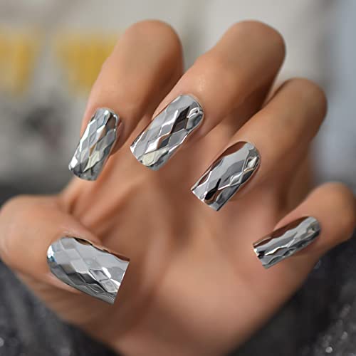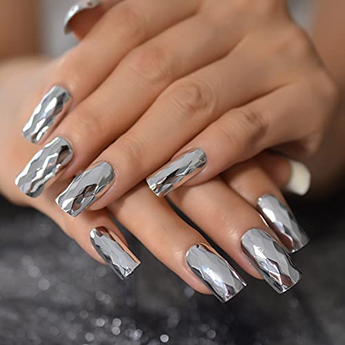 2. Silver 3D Surface Metallic Long Size Square Press ON Nails Perfect for daily