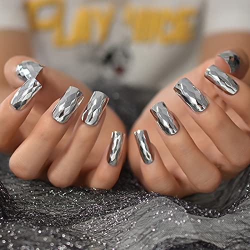 Metallic Medium Square Fake Nails Uneven Mirror Press On Nails Prismatic Shiny Full Cover Chrome Artificial Nail Tips Silver